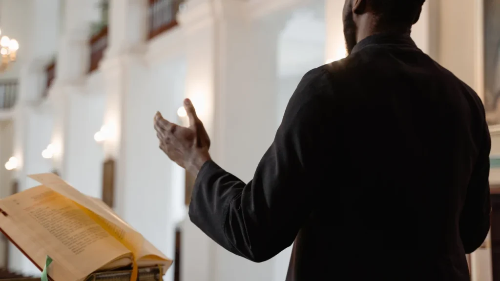 A church service is typically led by a pastor, priest, minister, or other religious leader.